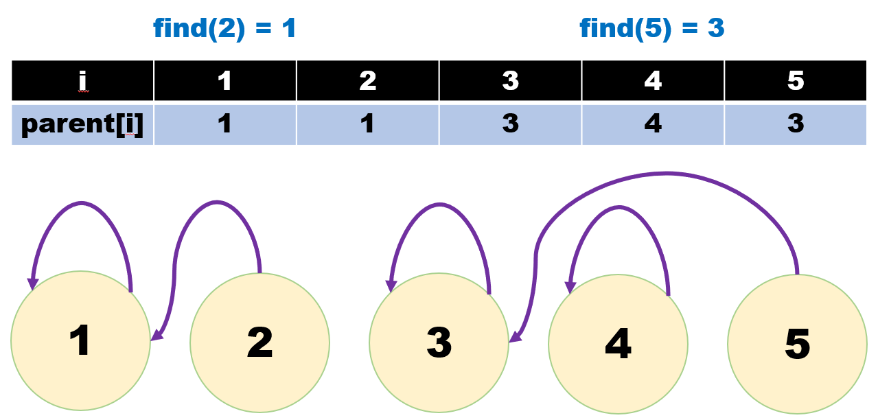 위 find(2)는 1을 반환하는 것처럼 보이지만 사실 반환된 1의 부모 원소인 1을 반환한 값입니다. 즉, 자신을 가리키는 1, 3, 5의 원소처럼 최종 부모 원소, 즉 루트 원소의 값만이 \( O(1) \) 로 반환되고 다른 원소를 부모로 가지는 원소들은 루트 원소를 재귀적으로 반환 받게 됩니다. 하지만 모든 원소를 \( O(1) \)의 수행시간과 가깝게 반환되도록 구성하는 방법이 존재합니다. (코드 구현에서 더 자세히 설명하겠습니다.)