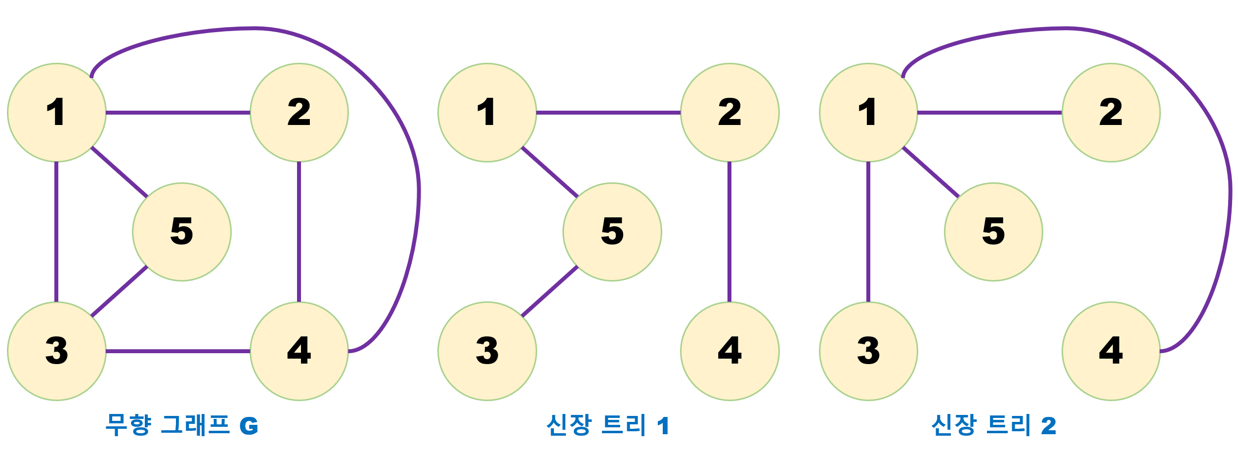 - 한 그래프에는 여러 가지 최소 신장 트리가 존재할 수 있습니다. 즉, 해결 답안이 여러개일 수 있습니다.